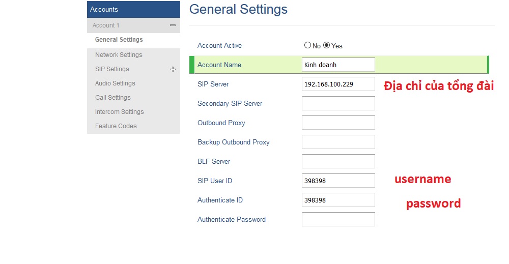 - Vào Account>Account1>General Setting, sau đó điền các thông số như hình bên dưới
